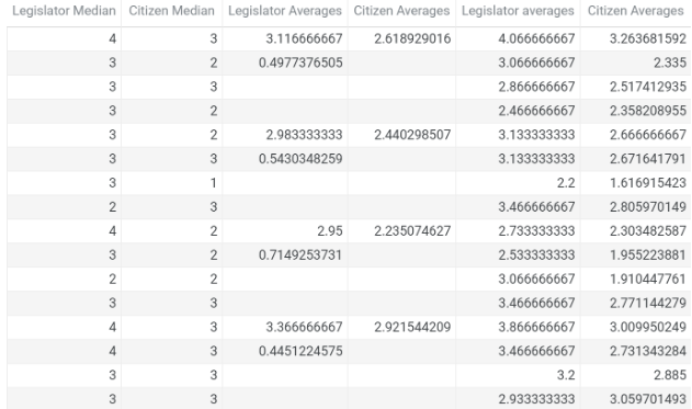 It’s also important to note that the majority of citizen indicators had averages of below 3 (13/16), meaning that the consensus among the population surveyed was that democracy was in practice, negative. Additionally, when considering the pillars as a whole, found by averaging all of the indicators for a given pillar, rights, representation, rule of law, and fair and equal participation, averages were all below 3, indicating disagreement. This is inconsistent with legislator responses as the majority of their democratic indicators (9/16) averaged at above 3, with ¾ of their pillars also receiving this treatment.